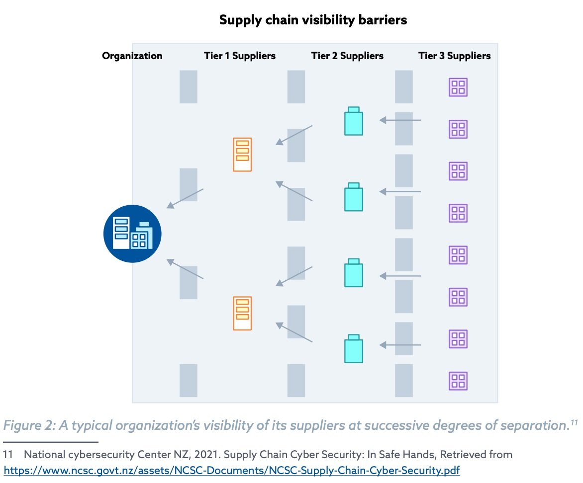 While it is not realistic to imagine that it would be possible to carry out risk assessment of all suppliers, figure 2 shows an alternative course of action that describes supply chain visibility barriers, with various levels of involvement. The recommendation is to focus on the primary suppliers and their suppliers’ suppliers.