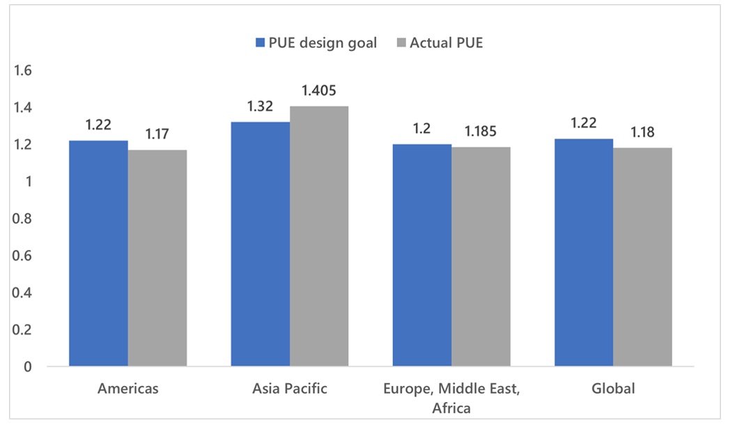 Microsoft’s commitment is to continually innovate in the design and maintenance of its data centers to get as close to 1 as possible. In the chart below, the blue bars show the estimated or projected PUE numbers, while the gray bars show the actual PUE numbers for Microsoft facilities. Just as an example, Microsoft points out that in the Asia-Pacific region, the actual PUE is the highest, in part due to higher ambient temperatures that require more cooling of data centers.
