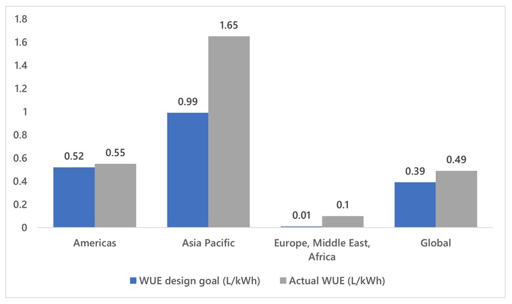 Similarly, Microsoft measures Water Usage Effectiveness (WUE) in its data center operations. As with PUE, there are variables that can impact this number, many related to the location of the facility. Data centers in colder parts of the world, such as Sweden and Finland, require less water for cooling. The following graph shows in blue the estimated or projected WUE values and in gray the actual values. Again, the Asia-Pacific region has the highest WUE due to the higher ambient temperatures and consequently the need to use water cooling in some places.
