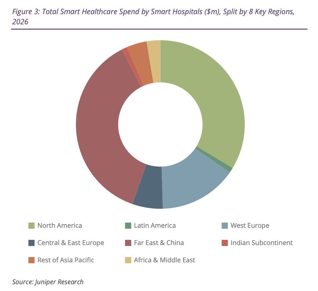 Die Studie zeigt auch, dass intelligente Krankenhäuser in den Vereinigten Staaten und China die weltweite Verbreitung von IoMT-Geräten anführen und bis 2026 21 % bzw. 41 % der angeschlossenen Geräte ausmachen werden. Die während der Pandemie umgesetzten digitalen Initiativen und die bereits weit fortgeschrittene Digitalisierung der Gesundheitsinfrastruktur waren der Schlüssel zur Sicherung der Führungsposition dieser Länder.