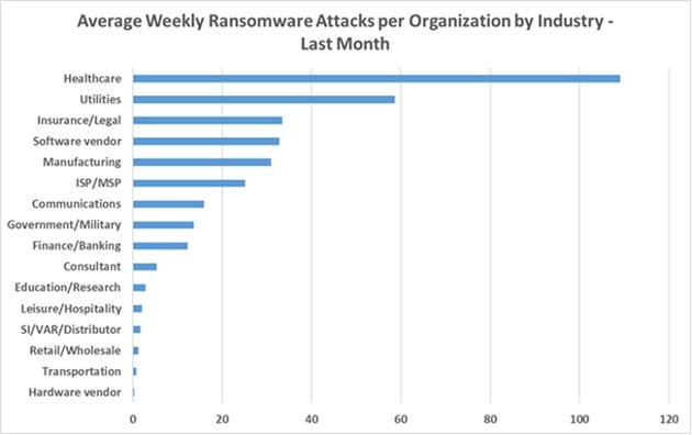 Die Branchen, die weltweit mit den meisten Ransomware-Angriffsversuchen konfrontiert sind, sind das Gesundheitswesen, Versorgungsunternehmen und Versicherungen/Rechtswesen.