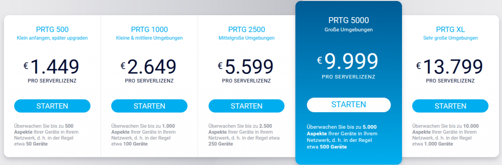 Auch Paessler bietet verschiedene Preismodelle an, die sich nach der Anzahl der Geräte richten, die Sie überwachen möchten. Die Preise liegen jedoch deutlich niedriger – ab 1.349 Euro für 50 Geräte. Es sind außerdem Dauerlizenzen erhältlich, mit denen sich bis zu 1.000 Geräte monitoren lassen. Mit der Testversion von Paessler PRTG können Nutzer bis zu 100 Dienste völlig kostenlos und zeitlich unbegrenzt überwachen.