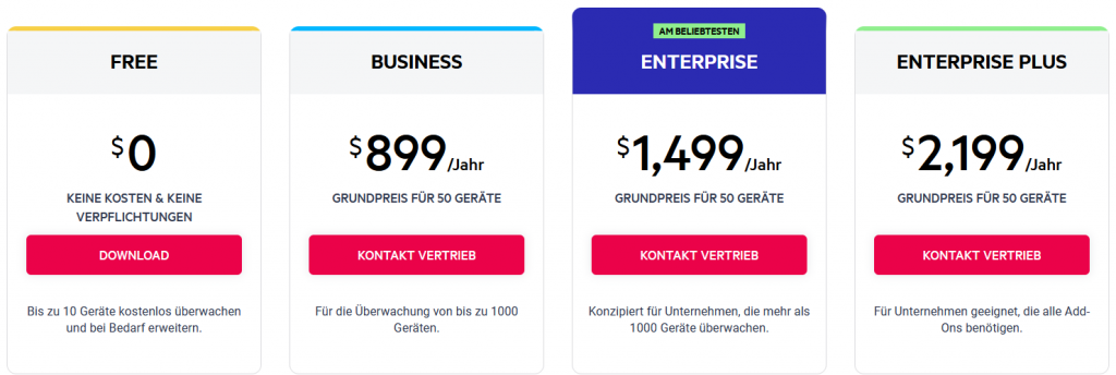 Wenn Sie mehr als 1.000 Geräte monitoren möchten, können Sie sich für ein Abonnement entscheiden. Wenn Sie ein solches Abo abschließen, erhalten Sie kostenlosen Zugang zu den neuesten Updates und kontinuierlichen technischen Support. Für Kostentransparenz sorgt der Preisplan auf der Website. Außerdem bietet Paessler eine uneingeschränkte und kostenlose Testversion für 30 Tage an, mit der Sie den vollen Funktionsumfang von PRTG ausprobieren können.