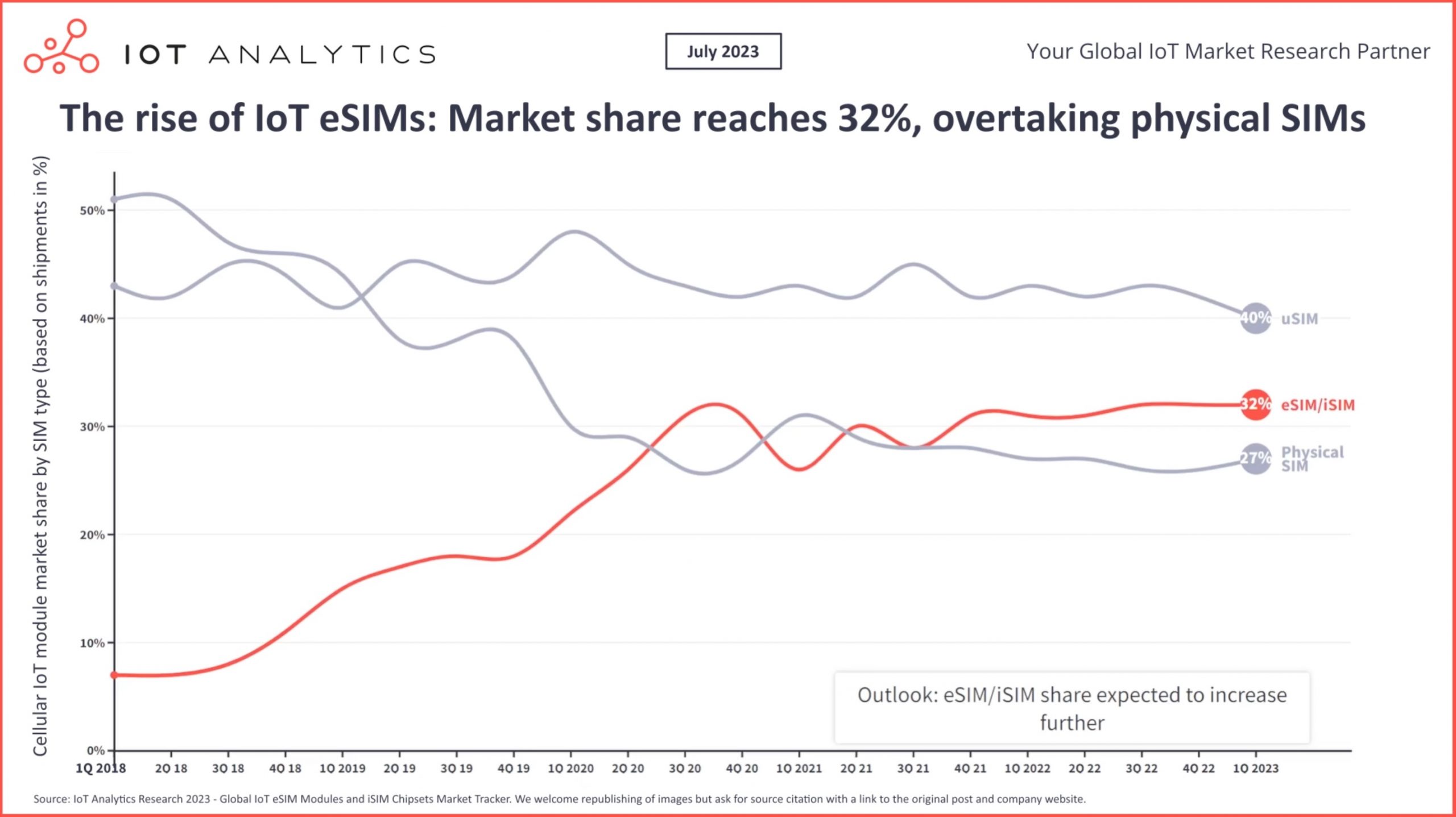 El ecosistema IoT celular, basado en los estándares mundiales 3GPP, está creciendo rápidamente. Y ya está empezando a acelerar su impulso con el gran rendimiento de los módulos eSIM/iSIM. El mercado de IoT eSIM/iSIM está a punto de superar la marca de los 500 millones de unidades en 2023, según las previsiones de IoT Analytics. Solo en el primer trimestre, más de 450 millones de módulos IoT pasaron a soportar el 16% de los 2.800 millones de conexiones IoT celulares activas en todo el mundo.