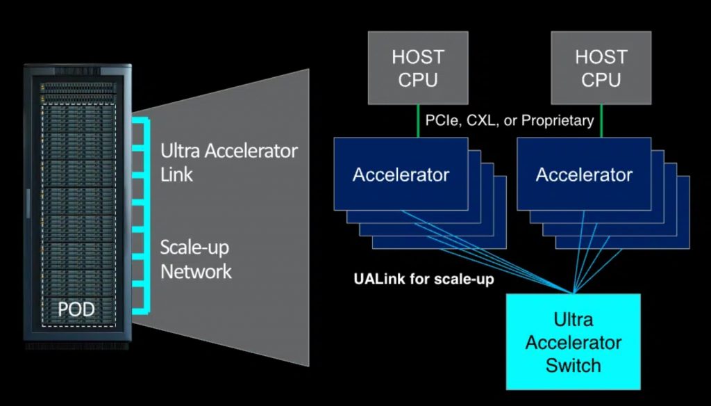 Podría decirse que, en términos de escalabilidad y rendimiento, UALink y NVLink están a la par. UALink se está desarrollando para conectar hasta 1.024 aceleradores dentro de un pod de computación de IA.