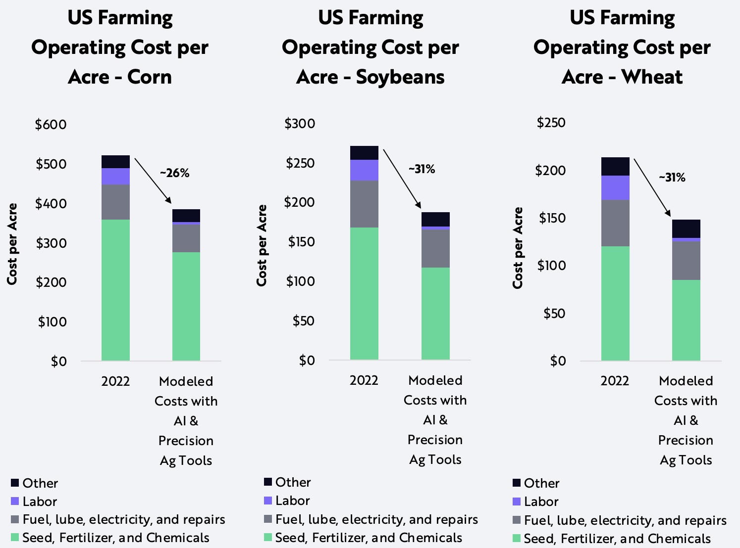 Según un estudio de Ark Invest, las prácticas agrícolas de precisión y la Inteligencia Artificial (IA) juntas tienen el potencial de reducir los costes anuales de explotación agrícola en más de un 22% en todo el mundo.