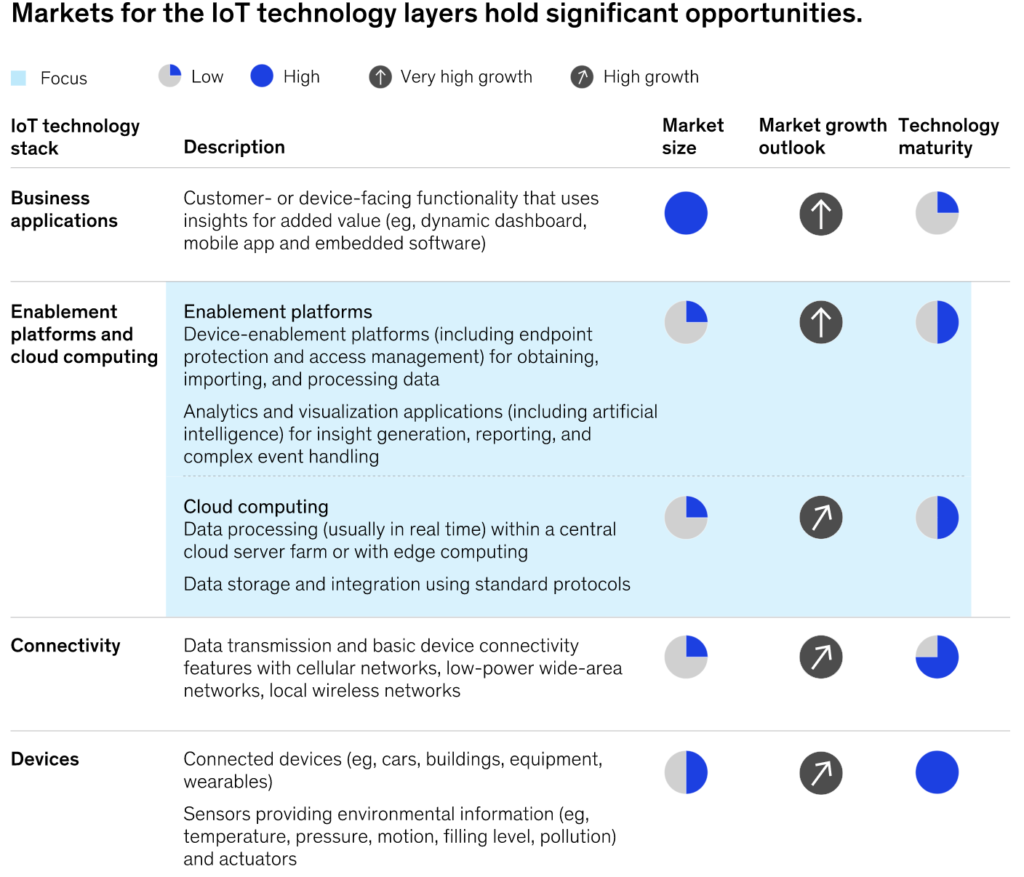 In addition, device enablement platforms – connecting devices, cloud providers, and applications for optimal processing in IoT settings – will be a notable source of growth and value. The ease of implementation of these platforms helps mid-sized companies take advantage of IoT opportunities, even if these companies have fewer resources for custom solutions compared to large enterprises.