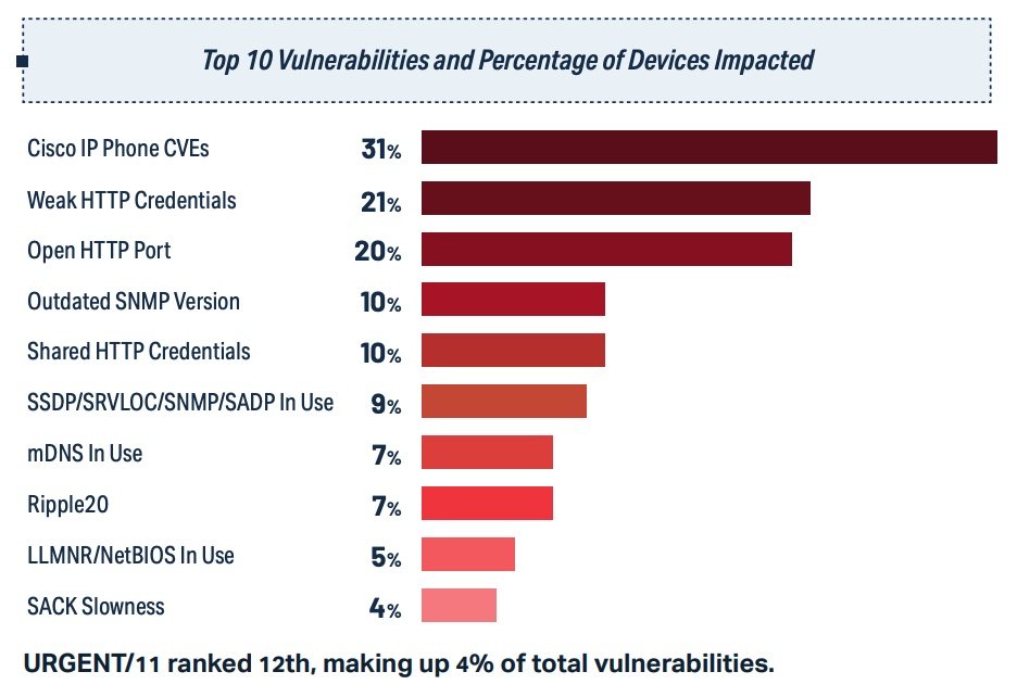Vulnerabilities widely reported in the last 12 months, such as URGENT/11 or Ripple20, are the most common risks faced by these devices. Of course, hospitals should protect against them. But the report warns that while the many articles written about these vulnerabilities have been great for creating general awareness about IoT security in healthcare, they represent only a small part of the risk that most healthcare IoT devices face.