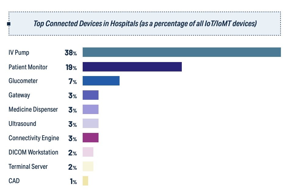 The infusion pump is the most common type of connected device in hospitals. They can remotely connect to electronic medical records, extract the correct dosage of a drug or other fluid and dispense it to the patient. So they are also the devices most likely to be exploited for vulnerabilities by hackers, according to the report – 73 percent had a vulnerability.