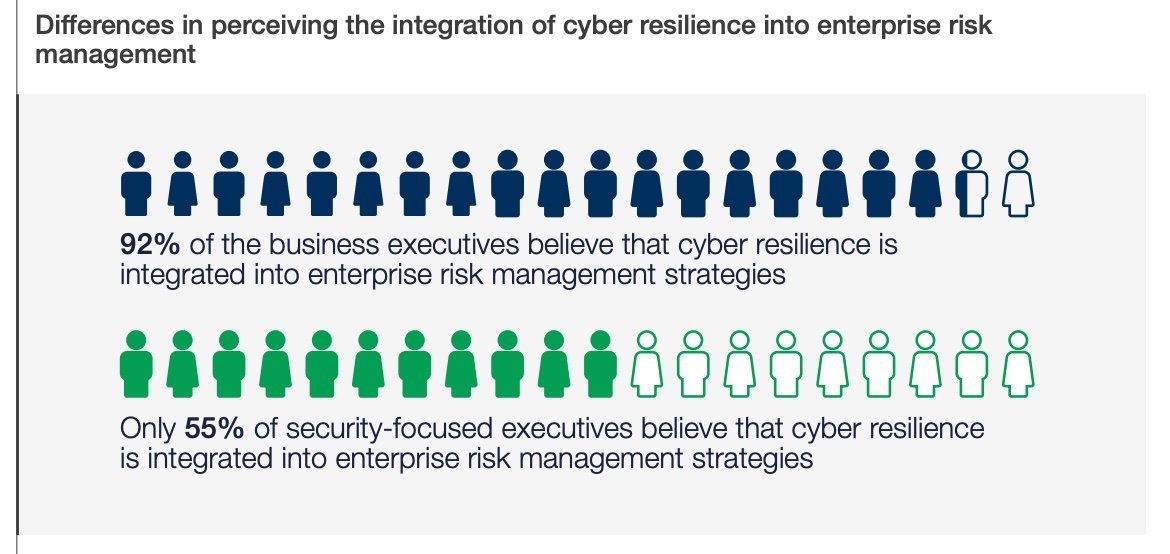 Other figures reinforce the difference in vision between the two areas. Some 92% of business executives say that cyber resilience is part of enterprise risk management strategies, but only 55% of cybersecurity leaders agree. Divergences like this, the result of inconsistent priorities and policies, can leave organizations more vulnerable to attack.