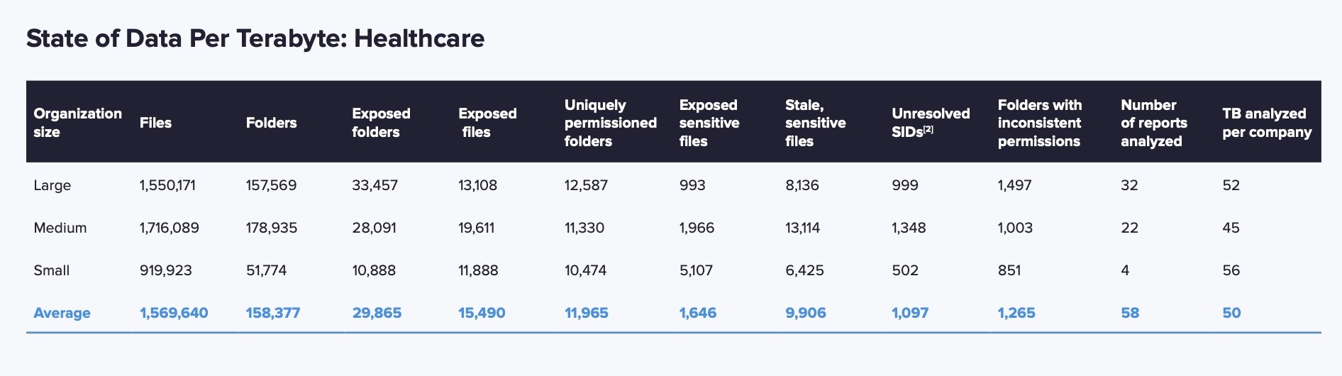 The Varonis table below shows the volume of compromised healthcare data in 2021. The average terabyte contains 1.3 million files. By assessing risk per terabyte, we can get a clearer picture of the typical attack surface by organization size and which ones are most vulnerable.