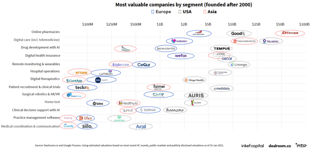 Só na Europa, por exemplo, o valor combinado das empresas de tecnologia para a saúde deve subir de US$ 8 bilhões em 2015 para US$ 41 bilhões este ano, com as farmácias online, as empresas de telemedicina e de monitoramento remoto e os serviços digitais de seguro saúde respondendo por mais de 70% desse valor. Já o emprego da IA para pesquisa e desenvolvimento de novos remédios e a robótica cirúrgica auxiliada pela Realidade Aumentada, somam 14%. Valores nada desprezíveis aos olhos de VCs que, segundo a Deloitte, em 2020 aportaram US$ 21,6 bilhões em healthcare e, somente no primeiro trimestre de 2021, mais US$ 7,1 bilhões.