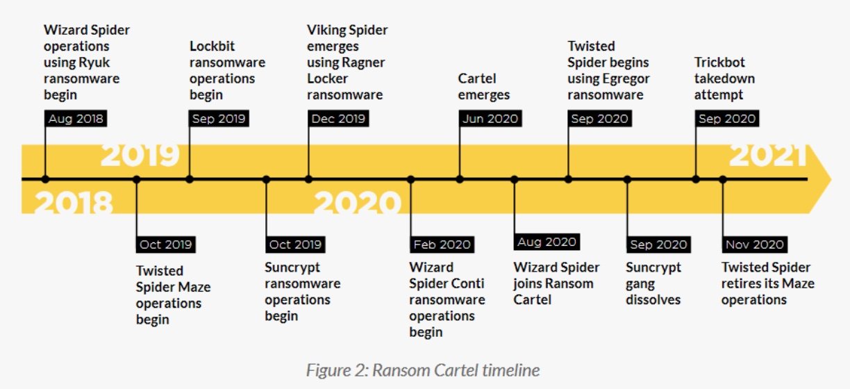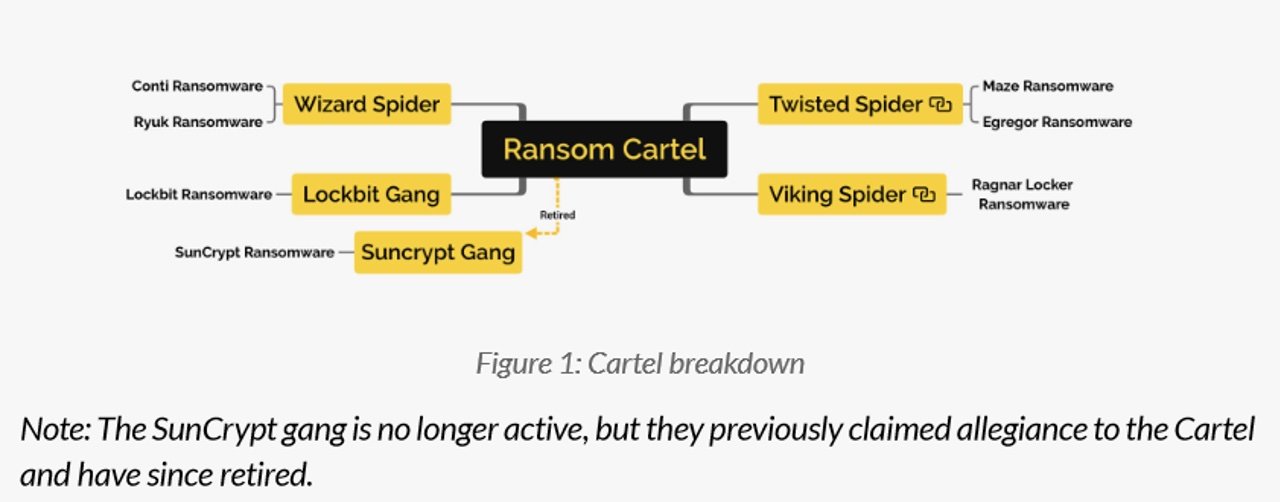 Segundo o estudo, o suposto cartel é composto atualmente por quatro gangues de ransomware: Twisted Spider, Viking Spider, Wizard Spider e Lockbit Gang.