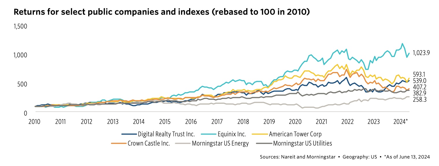 A digitalização da economia global exigiu um investimento maciço, levou a um rápido crescimento da demanda e se traduziu em retornos substanciais para os investidores desde a crise financeira global. Esses retornos, juntamente com a antecipação da enorme necessidade de computação da IA, coincidiram com mais dólares de investidores institucionais que buscam obter exposição à infraestrutura digital e seus ventos favoráveis.