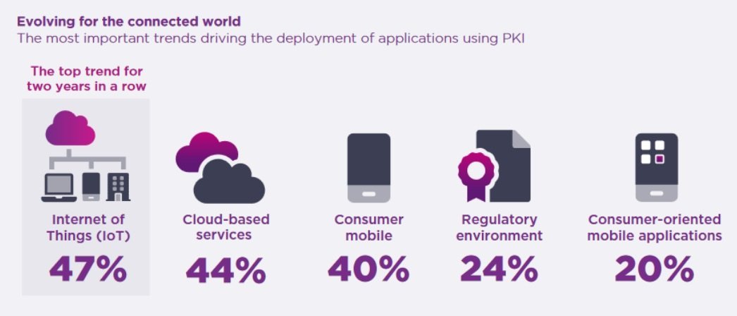 A Internet das Coisas (IoT) segue impulsionado o uso da Public Key Infrastructure (PKI) e de certificado digitais, sendo citada como principal motor de crescimento desse segmento por 47% dos entrevistados no estudo do Ponemon Institute intitulado 2021 Global PKI and IoT Trends, com mais de 2.500 profissionais de cibersegurança 17 países. Na edição de 2017 desse estudo, esse percentual era de 40%. Apenas como comparação, nesse mesmo ano, foram os serviços baseados na nuvem que se destacaram como principal motor de crescimento da PKI – apontados por 54% dos entrevistados; hoje essa parcela caiu para 44%.