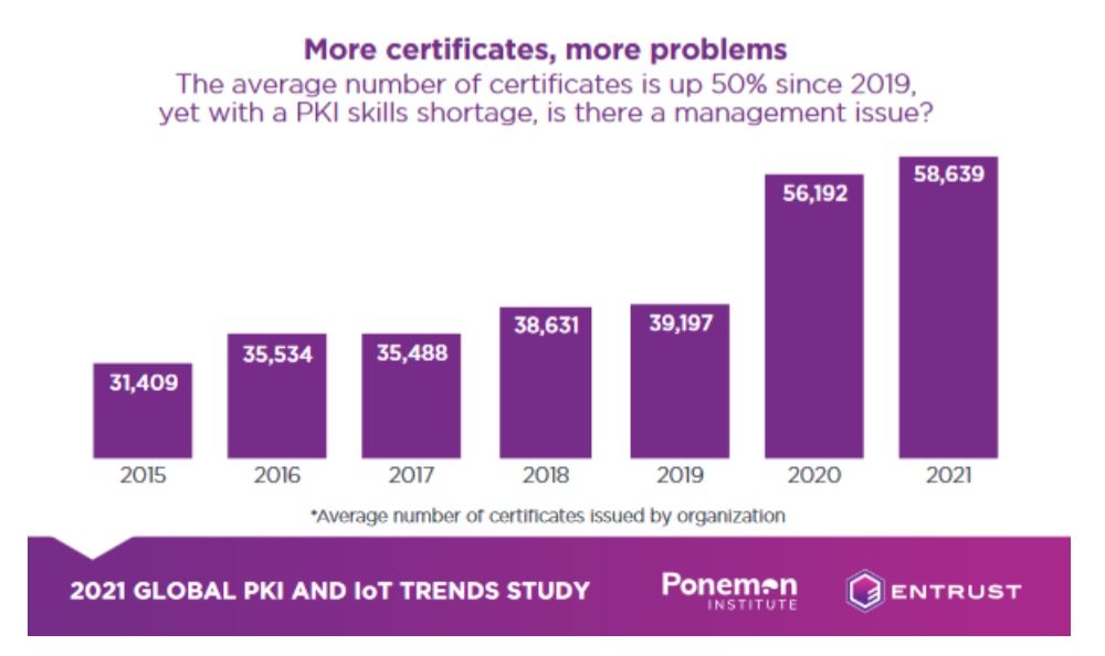 Ano a ano, há um crescimento lento e constante no número de certificados emitidos e gerenciados em diversos setores, não apenas no universo da IoT, porém houve um aumento significativo nesse volume nos últimos anos — cerca de 50% desde 2019 — de 39.197 para 58.639 — principalmente por conta da maior demanda de identidades para máquinas e proteção do trabalho híbrido.