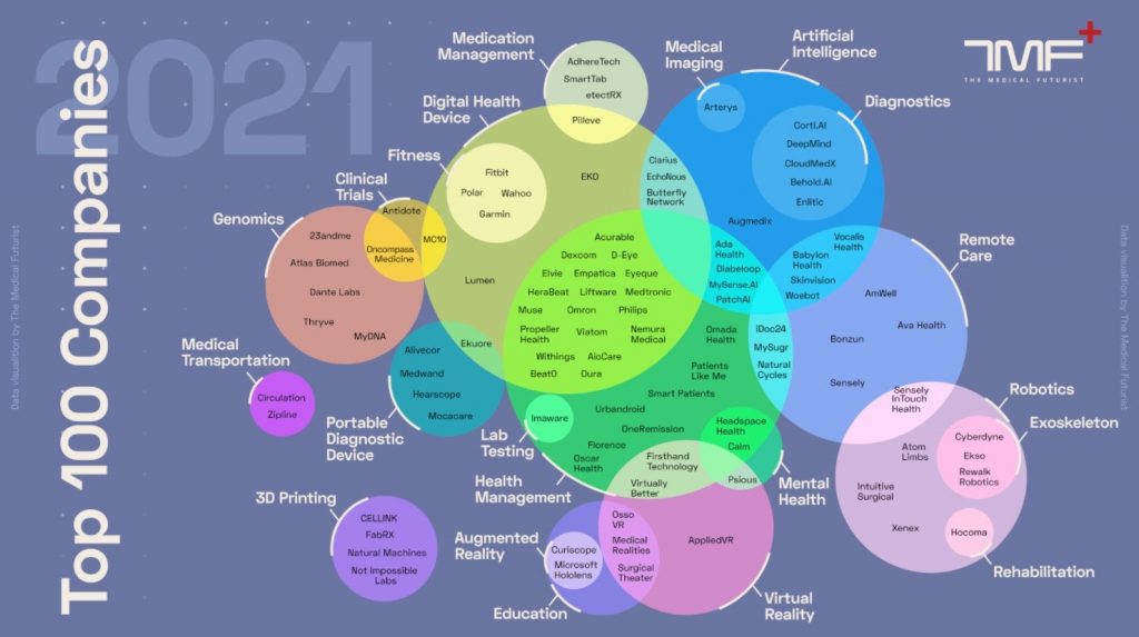 Para acompanhar as mudanças e o próprio mercado de saúde digital, a equipe do The Medical Futurist decidiu colocar as empresas mais importantes em um infográfico gigante. Ele aponta as TOP100 empresas digitais de saúde em 2021, segundo a entidade.