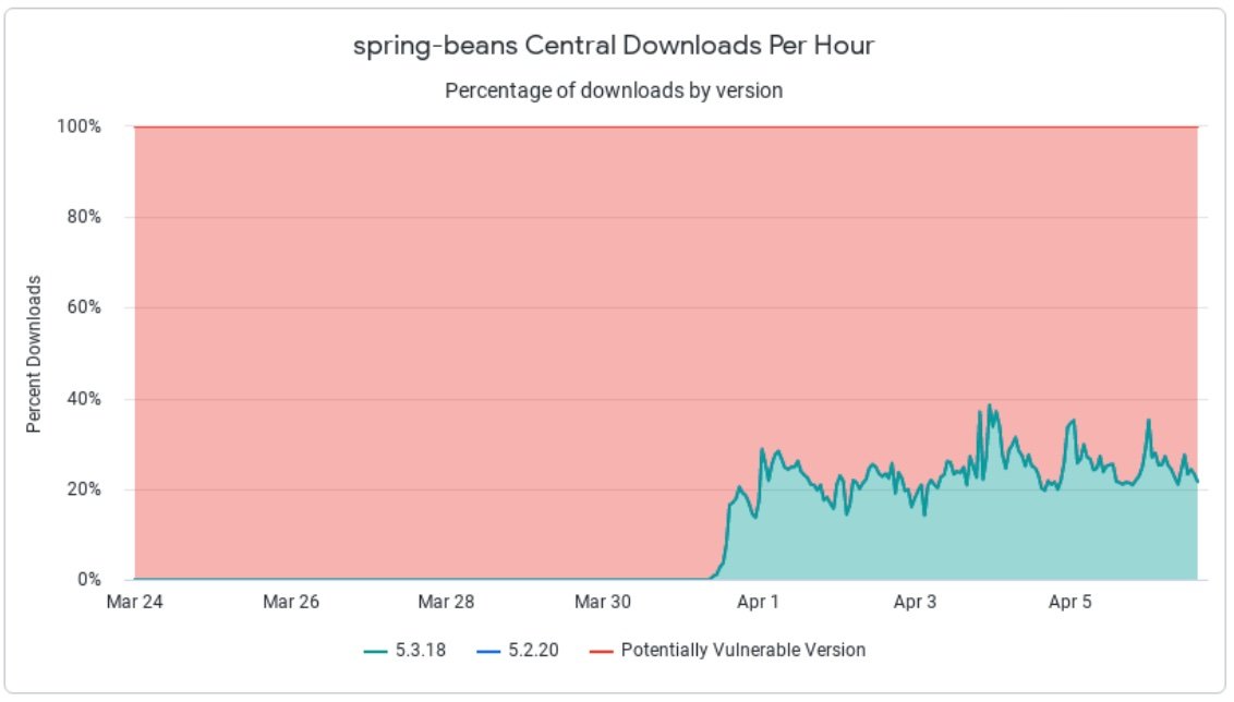 Outro ponto preocupante é que a velocidade com que os ambientes Spring estão sendo atualizados parece lenta. De acordo com a Sonatype, que mantém um painel para rastrear como estão sendo empregadas as correções para a Spring4Shell, 79% dos downloads do Spring desde 31 de março seguiam vulneráveis, sugerindo que os desenvolvedores não agiram prontamente para atualizar suas instâncias do Spring. Isso não significa, contudo, que os aplicativos que executam versões sem patches do Spring estejam necessariamente vulneráveis.