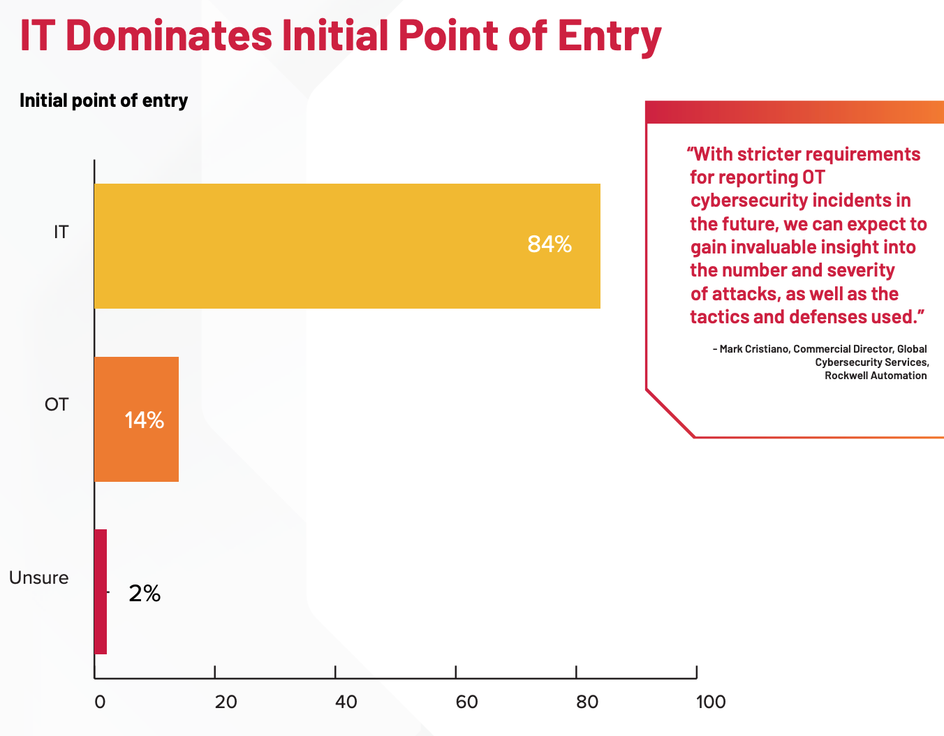 More than 80% of events began due to the compromise of an IT system. With increasing levels of interconnectivity, more OT networks are communicating with the outside world via an IT network, increasing attack surfaces.