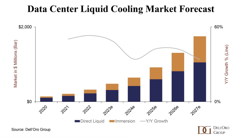 Revenues generated by liquid cooling systems are expected to reach US$2 billion by 2027, according to a forecast by Dell’Oro Group, driven mainly by thirsty Generative Artificial Intelligence (AI) workloads.
